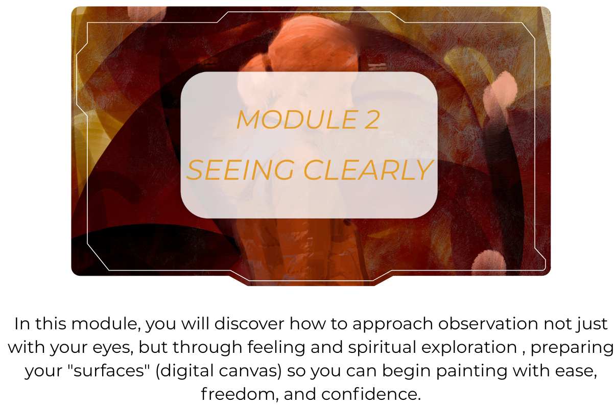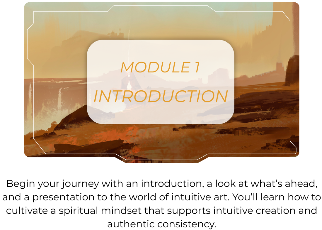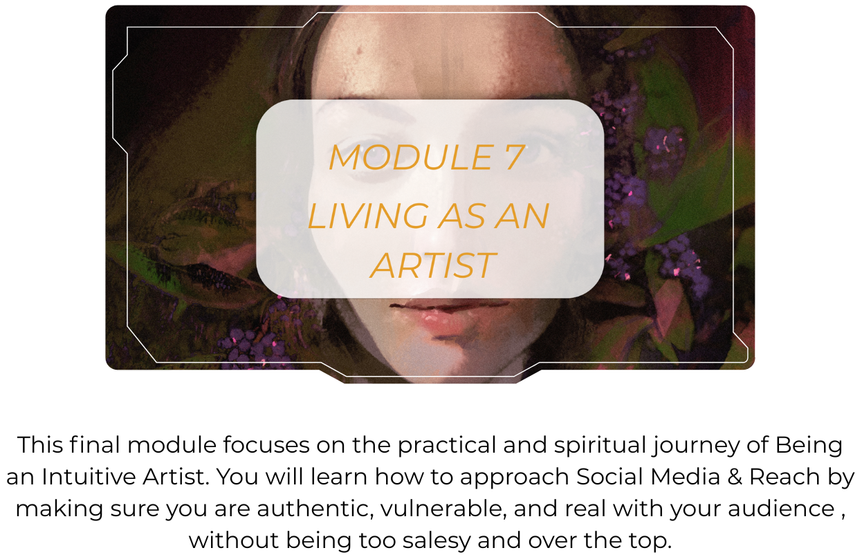 Within Painting From Within, you will find 7 comprehensive modules starting with the basics of intuitive creation and technical setup and ending with specific methods for emotional storytelling and transformation. I strongly recommend that you watch the sessions in order, as we will see progressively more complex topics on the path to creative freedom. Remember that you have lifetime access to go back and watch the lessons as often as you need to find your flow!